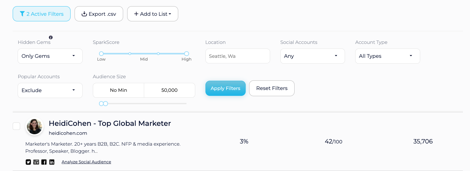 You can filter your social media results to only show accounts with high engagement and a certain audience size